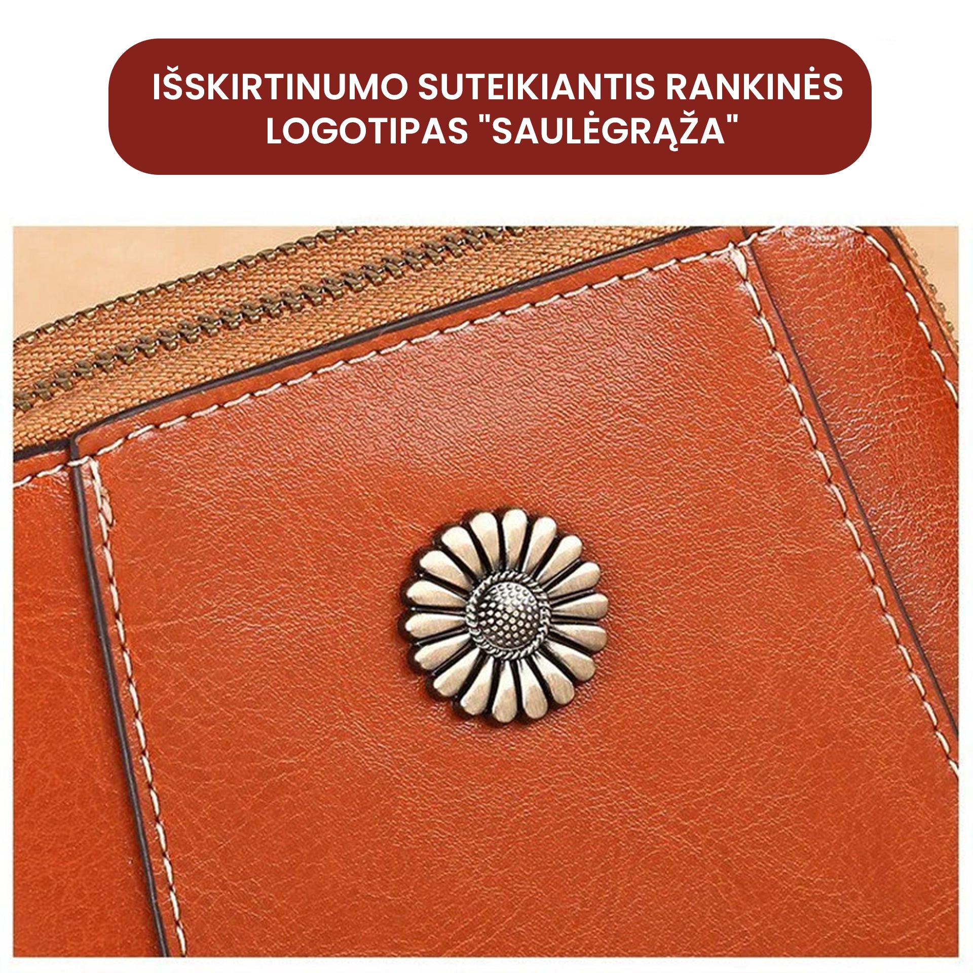 - Rankinės struktūra: 2 pagrindiniai skyriai, 1 užtraukiama kišenė, 4 kortelių įdėklai.