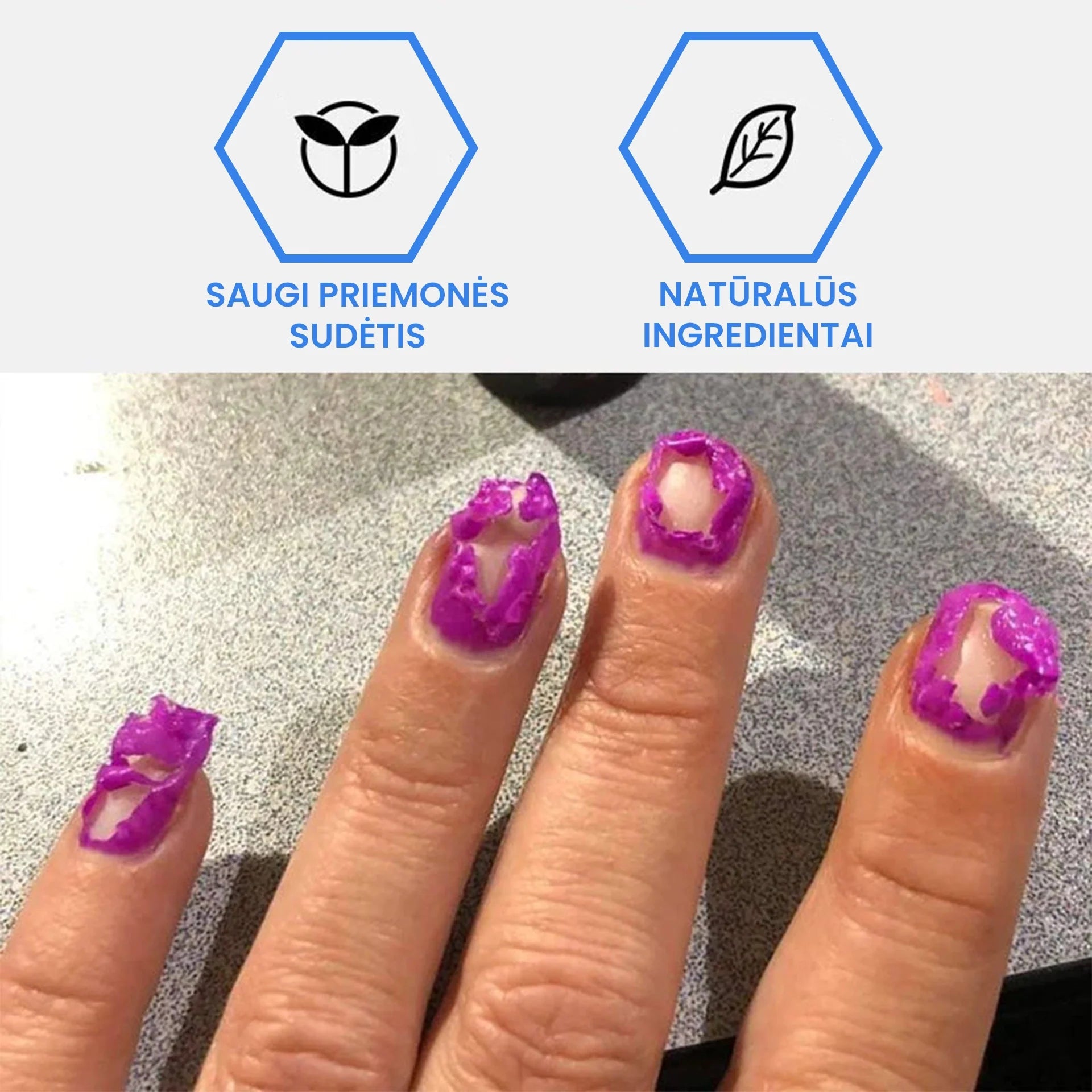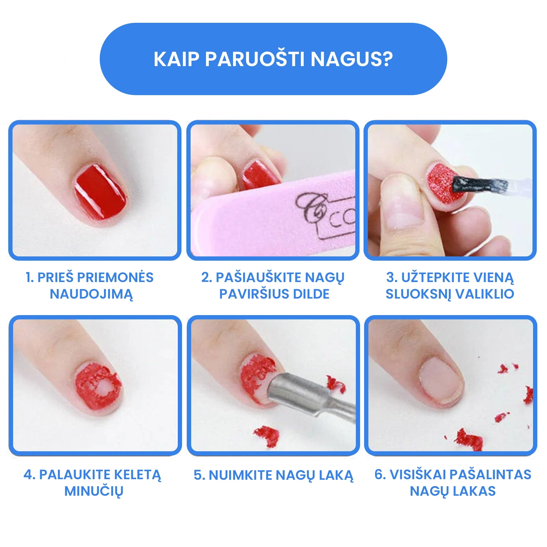 Lengva naudoti! Užtepkite valiklio ant nago ir luktelėkite porą minučių. Stebėkite kaip nagų lakas atšoksta nuo nago plokštelės!