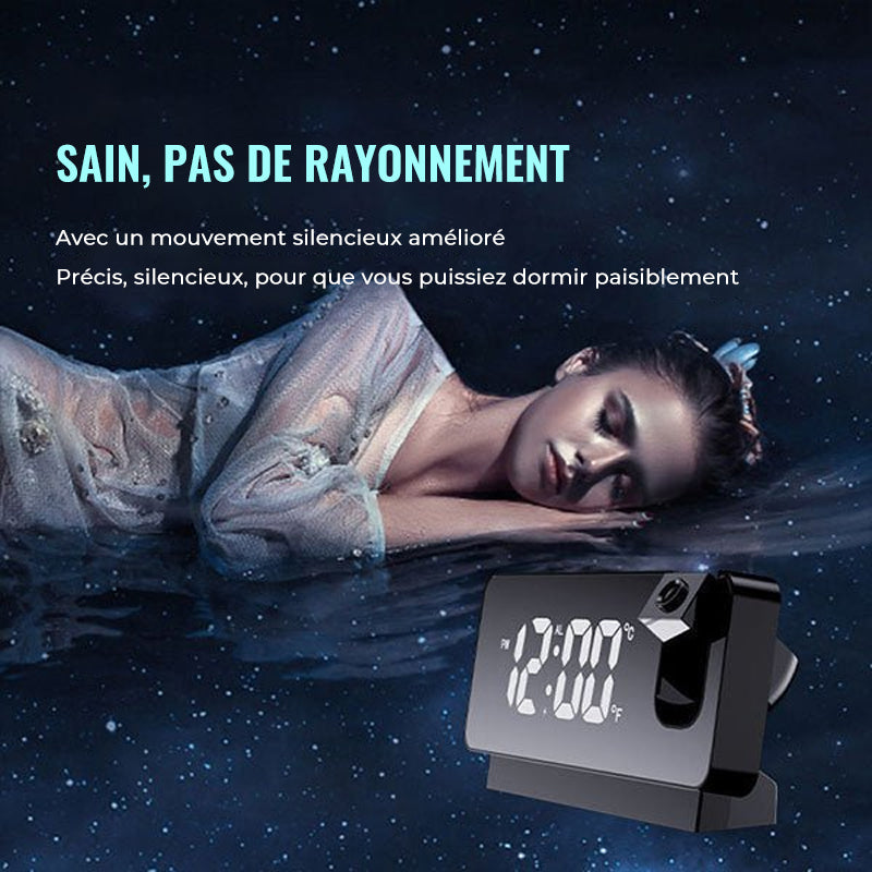 Tai išmanus skaitmeninis laikrodis, kuris turi projektorių! Patobulinta projektoriaus galvutė gali pasisukti 180 laipsnių kampu, todėl galite laikrodžio laiką matyti ant sienos ar lubų. Tinkamas atstumas tarp laikrodžio ir sienos turi būti ne didesnis nei 3 metrai.